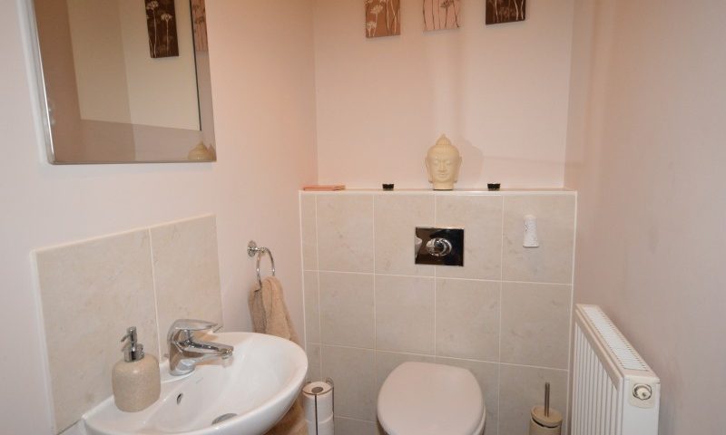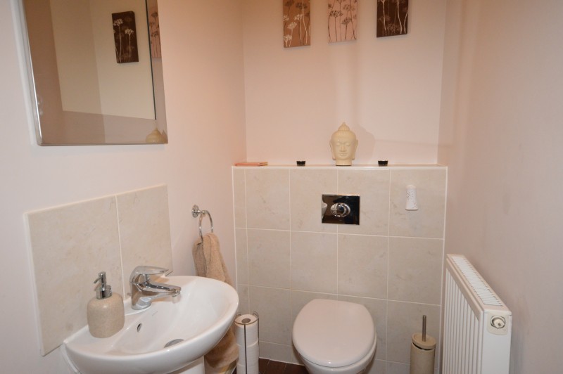 Wall mounted heated towel rail, close coupled wc, wash hand basin, opaque double glazed window to front, fully tiled shower cubicle.