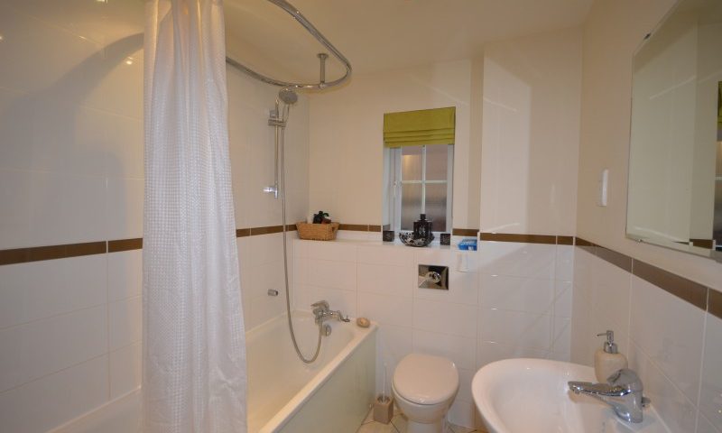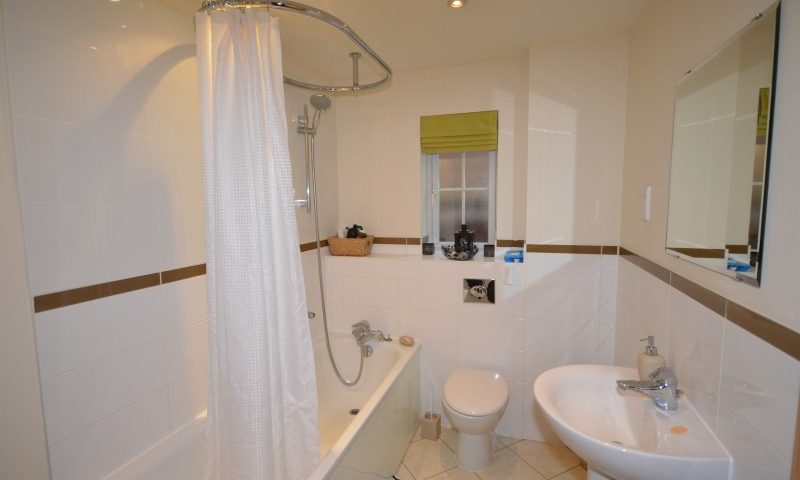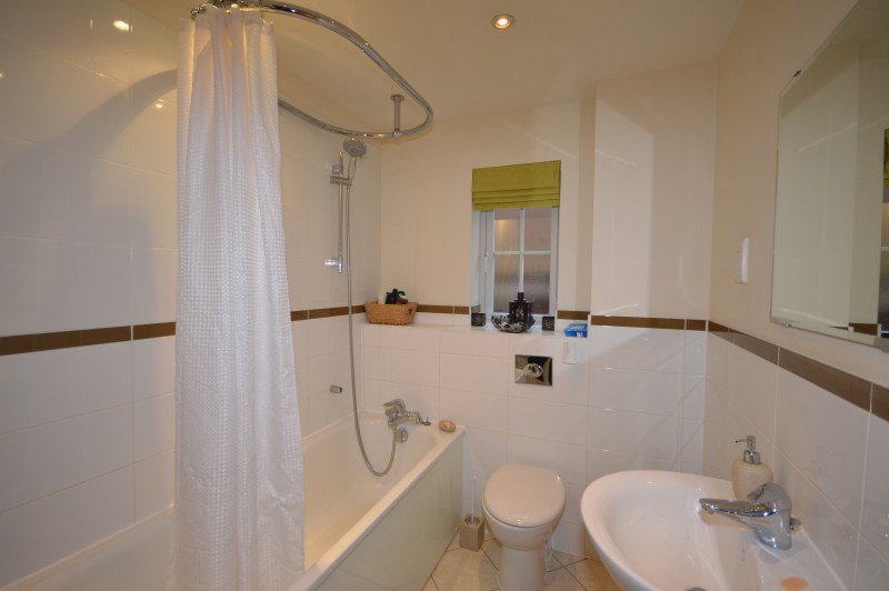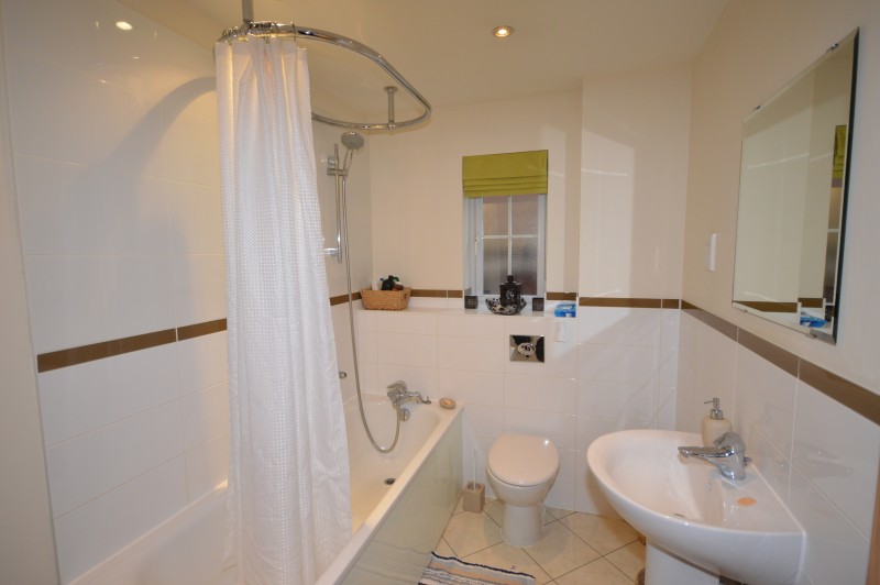 Wall mounted heated towel rail, bath with shower attachment, close coupled wc, opaque double glazed window to side, wash hand basin, shaver point, extractor fan.